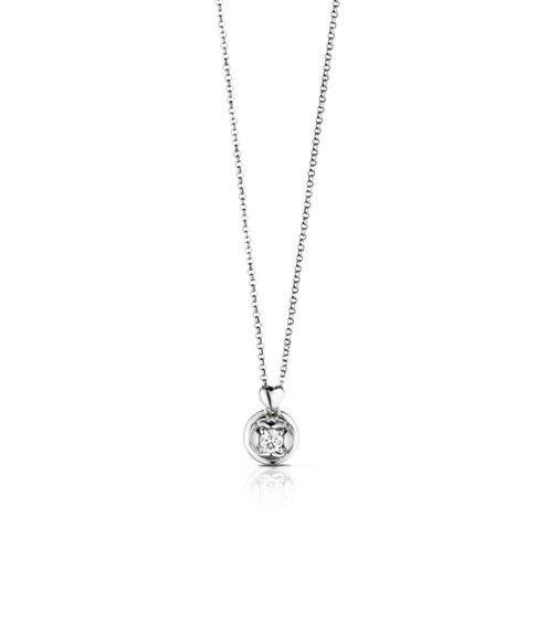 Punto luce in oro bianco 18 kt con castone a graffe che monta un diamante taglio brillante di 0,11 ct e lateralmente incisi due maschietti e due femminucce, catenina in oro bianco 18 kt rolò cm 42 accorciabile di 4 cm. Certificato di garanzia originale.