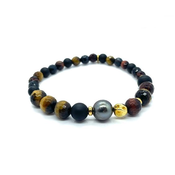 BRACCIALE CON ELEMENTI IN ARGENTO 925% CON GALVANICA IN ORO GIALLO, ONICE NERO E OCCHIO DI TIGRE.