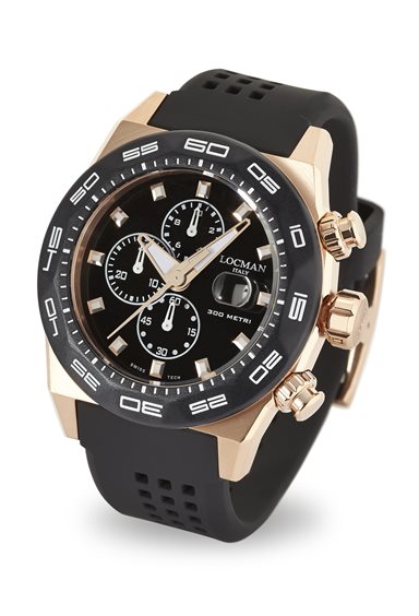 orologio in acciaio trattato pvd nero e titanio, diametro 45 mm, movimento cronografico al quarzo, vetro zaffiro, cinturino silicone con chiusura ardiglione, pulsanti e corona a vite, fondo titanio a viti, water resistant 300 m