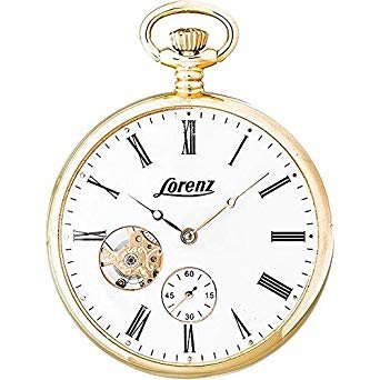 Orologio da tasca solo tempo. Quadrante di colore bianco e ore romane, due sfere piccoli secondi. Catena Da Tasca e supporto. Movimento Carica Manuale. Questo da tasca verrà spedito con scatola originale Lorenz.