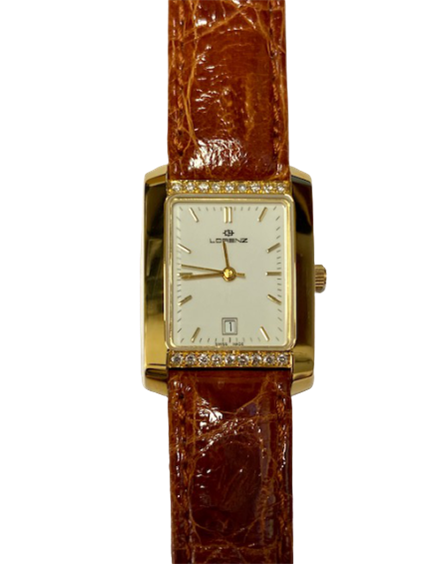 Orologio marca "Lorenz" con cassa in oro giallo massiccio 18ct mm25x22 con incastonati 18 diamanti taglio brillante, movimento al quarzo "Swiss made" ,quadrante bianco con numeri arabi ,vetro zaffiro, datario , cinturino in vero coccodrillo color marrone, WR 3atm.