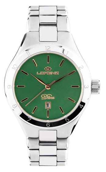 Orologio marca Lorenz collezione Diva con cassa e bracciale in accciaio, movimento al quarzo, quadrante verde e indici rosè, datario, wr 5 atm. 3 anni di garanzia