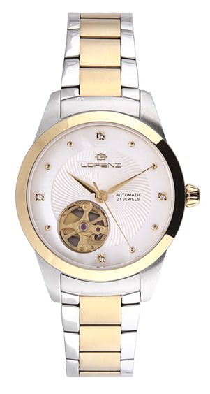 Orologio Lorenz con cassa e bracciale in acciaio e placcatura oro 18ct, movimento automatico 21jewels con oblò a vista. Quadrante con contorno in madreperla e 4 brillantini, vetro minerale, fondo a vite, WR 3 ATM. Chiusura con sicurezza.