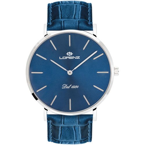 Orologio Solo Tempo Da Uomo Lorenz Della Collezione Classico Elegante. Orologio Con Cassa In Acciaio, Di Forma Rotonda E Vetro Zaffiro Di Misura 38 Mm. Questo Modello Ha Un Quadrante Blu Con Indici A Bastone E Cinturino In Pelle Blu Con Chiusura Ad Ardiglione, Con Ansa Di Misura 20 Mm. La Lunghezza Del Cinturino È Di 7+11 Cm. La Resistenza All'Acqua È Di 3 Atm Ed È Caratterizzato Da Movimento Seiko Vj20. Orologio Con Due Sfere, Extrapiatto. La Referenza È 030083Cc. GARANZIA 3 ANNI
