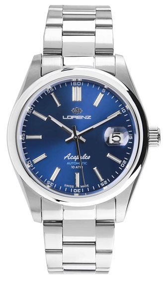 Orologio Lorenz in acciaio 316L con movimento automatico swiss made, vetro zaffiro , quadrante blu con indici in rilievo, datario con lente, corona e fondello a vite, chiusura con pulsanti. WR 10atm.