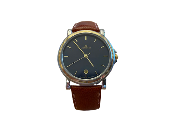 OROLOGIO LORENZ CON CASSA IN ACCIAIO CON GHIERA ORO, CINTURINO IN VERA PELLE MARRONE, MOVIMENTO AL QUARZO SWISS MADE, QUADRANTE COLOR BLU CON INDICI IN RILIEVO , WR 3 ATM. GARANZIA 3 ANNI