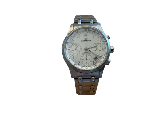 OROLOGIO LORENZ CON CASSA E BRACCIALE IN ACCIAIO, MOVIMENTO CRONOGRAFO AUTOMATICO SWISS MADE, VETRO ZAFFIRO , QUADRANTE BIANCO CON ORE ARABE , SFERE LUMIBRITE, FONDO A VITE , WR 5 ATM. GARANZIA 3 ANNI