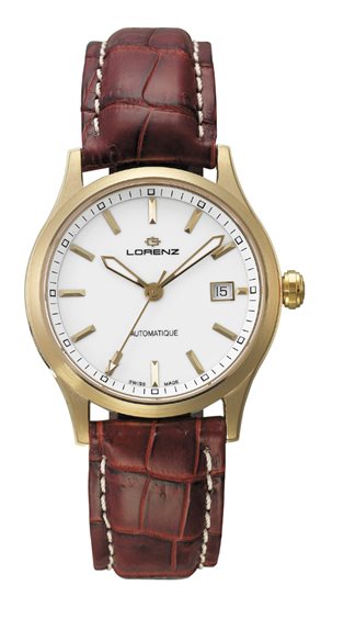 Orologio marca Lorenz con cassa in oro giallo 18ct, movimento meccanico con carica automatica "swiss made", vetro zaffiro , quadrante bianco con indici in rilievo, datario, WR 5 atm., cinturino in vero coccodrillo gold.