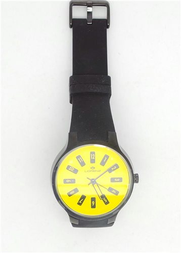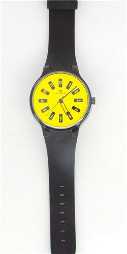 Orologio al quarzo, cassa in acciaio con trattamento IP nero lucido, diametro cassa mm 43. Impermeabile 5 atmosfere, fondello a pressione, vetro minerale, cinturino in silicone nero. Quadrante giallo con 12 finestrelle rettangolari che incorniciano i numeri arabi gialli su fondo nero, lancette smaltate.