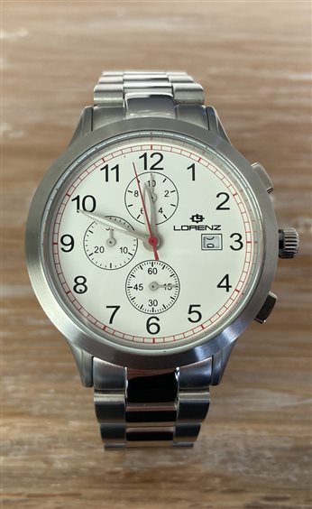 OROLOGIO LORENZ CON CASSA E BRACCIALE IN ACCIAIO ,CHIUSURA CON SICUREZZA , MOVIMENTO CON CRONOGRAFO AL QUARZO CON DATARIO, QUADRANTE BIANCO CON ORE ARABE , FONDO A VITE , WR 10 ATM.