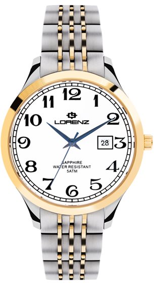 OROLOGIO LORENZ COLLEZIONE 'OLIMPIA' CON CASSA E BRACCIALE BICOLORE ,CHIUSURA A FARFALLA CON PULSANTI, VETRO IN ZAFFIRO INSCALFIBILE , MOVIMENTO AL QUARZO MIYOTA GN10 CON DATARIO, QUADRANTE BIANCO CON ORE ARABE E SFERE BLU, WR 5 ATM.