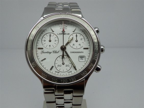 Cronografo al quarzo con movimento svizzero ETA 251.262. Lunetta fissa con scala tachimetrica, fondello serrato a pressione. Bracciale con motivo particolare per l'inserimento nella cassa, chiusura a farfalla a scomparsa.