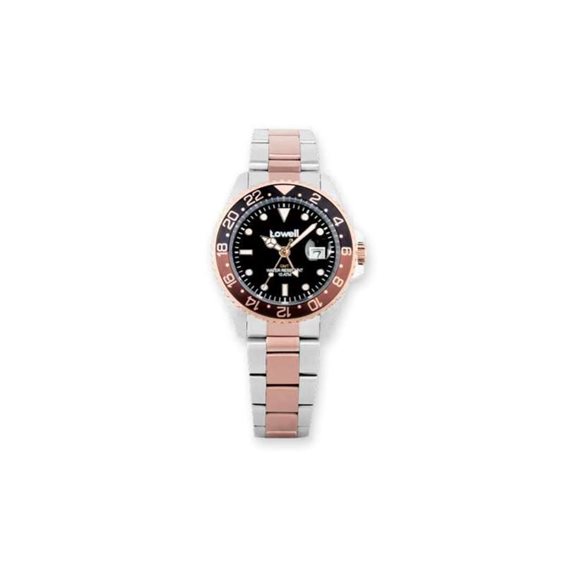 Cassa in acciaio satinato e lucido diam. 40 mm. - Spessore 12 mm. - Vetro minerale piatto - Corona a vite personalizzata - Fondello a vite - Ghiera girevole unidirezionale bicolore con scala 24 ore - Larghezza ansa 20 mm. - Movimento al quarzo Ronda 505.24H - Batteria SR621SW - Indicazione ore, minuti e secondi e funzioni GMT - Numerali luminescenti in rilievo - Sfere luminescenti - Datario a finestrella ad ore tre con lentino - Bracciale solido in acciaio con chiusura deployante e fibbia di sicurezza - Dive suit extension per indosso sopra indumenti - Water resistant 10 ATM (100 metri)