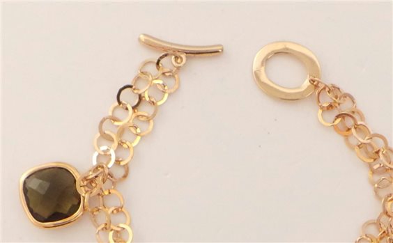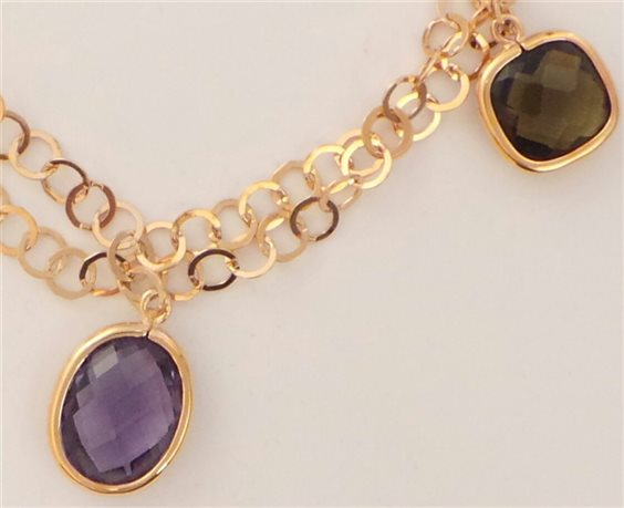 bracciale in argento laminato oro rosa, con charmes appesi in cristalli naturali ametista e grigio fumo, chiusura a paletto, lunghezza totale 19,5cm
