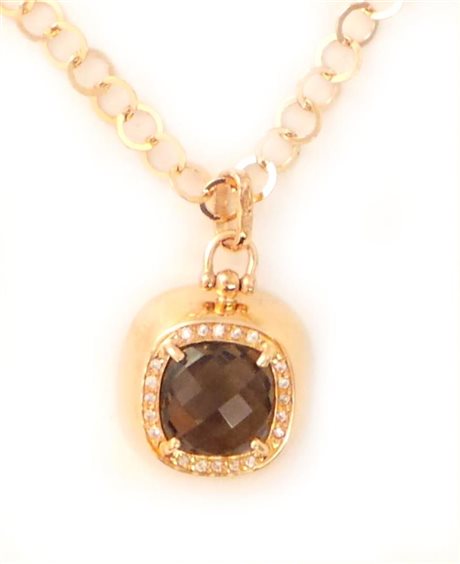 Collana in argento ad anelli laminata oro rosa lunghezza 43cm, con pendente in argento laminato oro rosa, con quarzo grigio fumo e contorno di zirconi, retro finemente lavorato, diametro 2,2cm