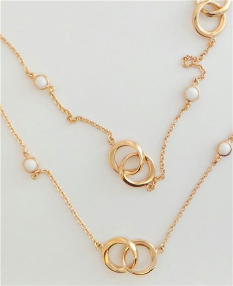 collana in argento laminato oro rosa con anelli intrecciati e pietre naturali in agata bianca sfaccettate, lunghezza totale 66cm