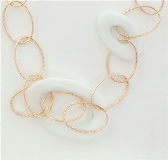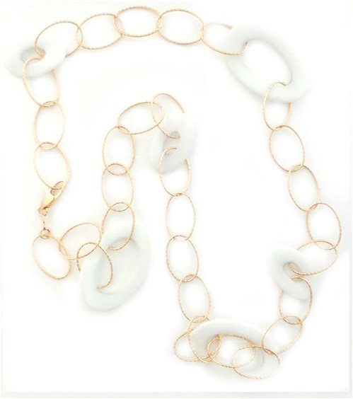collana in argento laminato oro rosa, lunga 62cm con alternati anelli in agata bianca di misura irregolare, chiusura a moschettone