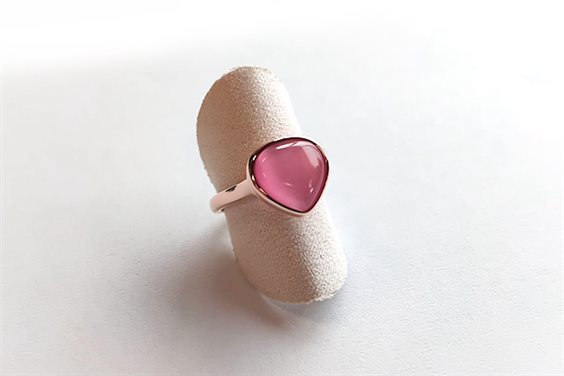Anello in argento rosè 925 con quarzo idrotermale color ciliegia. Il gambo è aperto e regolabile a misura