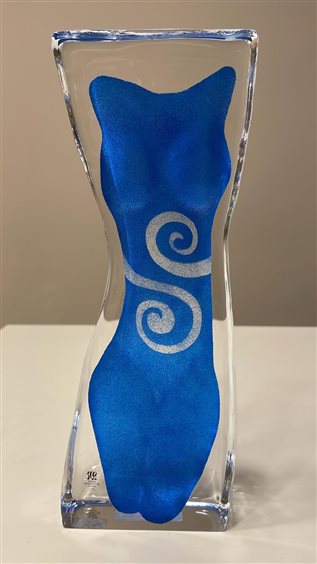 SCULTURA SAGOMA DONNA BLU SATINATO CON DECORI ASIMMETRICI IN CRISTALLO SVEDESE MALERAS. MATS JONASSON MALERAS è la patria dell'artigianato tradizionale svedese del cristallo e di una forte tradizione artistica svedese e rappresenta una nuova generazione di designer e artigiani. Mats Tomasson è un maestro del dettaglio e, da oltre 30 anni, ha impresso il suo marchio sulla vetreria di Mäleras, dove l'azienda è sinonimo di creatività brillante. Un oggetto in vetro di Mäleräs Glassworks dà la garanzia di avere una creazione in cristallo completamente svedese.