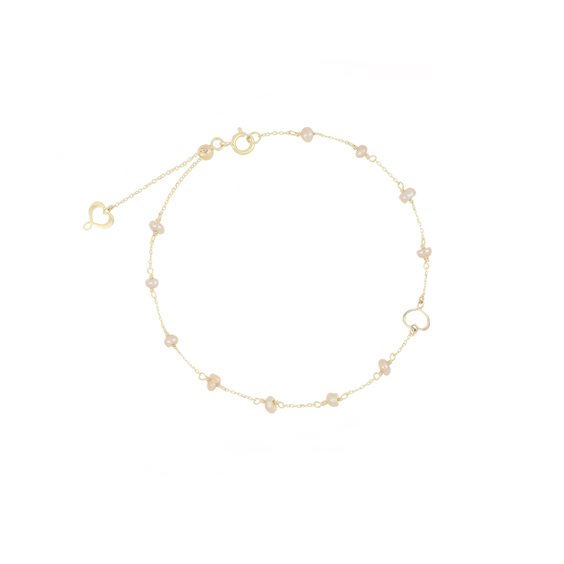 Bracciale realizzato in oro giallo 18 carati con perle naturali d'acqua dolce. Il bracciale presenta un cuore Maman di 5 mm lungo la catena e un cuore Maman all'estremità. Il bracciale può essere regolato da un minimo di 13 cm fino ad un massimo di 18 cm grazie alla piccola sfera scorrevole. Chiusura con anello a molla.