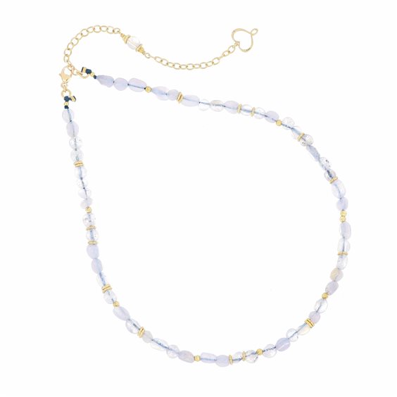 Girocollo in argento 925 con galvanica oro giallo ad alto spessore e ad alta resistenza. Il girocollo è ricoperto per tutta la sua superficie da pietre di calcedonio alternate ad elementi decorativi in argento. Può essere regolato da un minimo di 35 ad un massimo di 44,5 cm. Cuore Maman traforato all'estremità. Chiusura a moschettone.