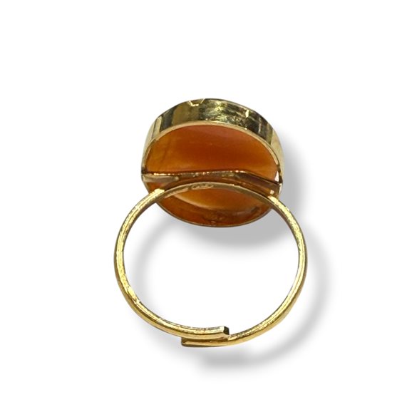 Delicato anello in argento dorato 925 con cammeo classico inciso con volto di donna. Il design semplice ed elegante lo rende perfetto per un uso quotidiano o come idea regalo. Cammeo mm 20 c.ca Anello di misura regolabile dal numero 10 al numero 16 c.ca Piccole eventuali imperfezioni dovute alla realizzazione a mano non sono considerate difetto ma una peculiarità dell’hand made.