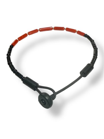 Bracciale da uomo cannettina ebano con corallo rosso Sardegna, agata nera e pallini in argento, chiusura Botton Loop. Misura bracciale cm 20