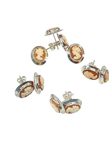 Orecchini in argento Sterling 925 con cammeo di prima scelta su conchiglia corniola con incisione testa di donna interamente fatta a mano, chiusura pressione con farfallina. Cammei mm 10 Piccole eventuali imperfezioni dovute alla realizzazione a mano non sono considerate difetto ma una peculiarità dell’hand made.