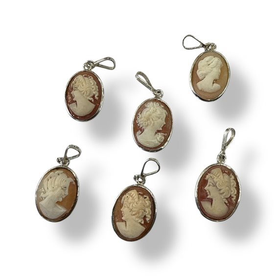 Ciondolo,in argento Sterling 925, montatura a filo, cammeo su conchiglia corniola o sardonica, con incisione testa di donna interamente fatta a mano, dimensione cammeo 15 ~ 18 mm. Piccole eventuali imperfezioni dovute alla realizzazione a mano non sono considerate difetto ma una peculiarità dell’hand made.