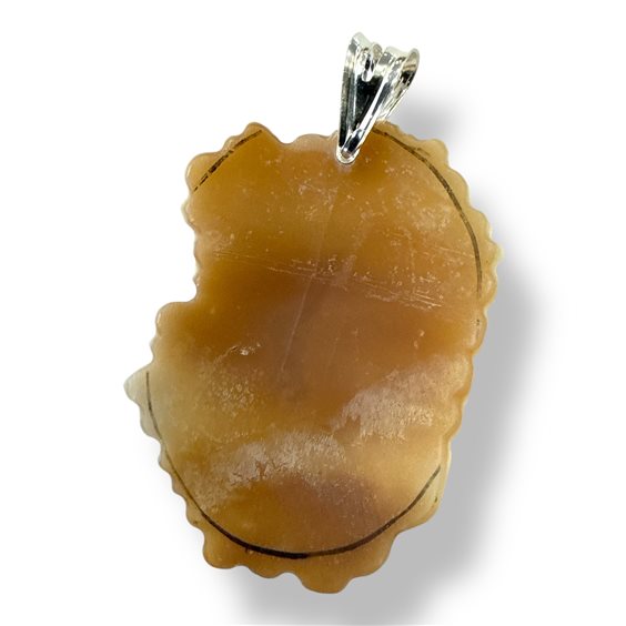 Ciondolo cammeo su conchiglia sardonica con incisione testa di donna interamente fatta a mano, dimensione cammeo mm 50 x 40 c.ca con contromaglia in argento Sterling 925. Piccole eventuali imperfezioni dovute alla realizzazione a mano non sono considerate difetto ma una peculiarità dell’hand made.