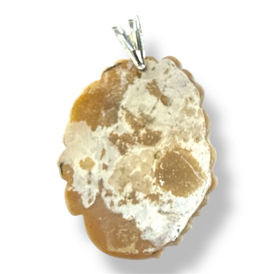 Ciondolo cammeo su conchiglia sardonica con incisione testa di donna interamente fatta a mano, dimensione cammeo mm 50 x 40 c.ca con contromaglia in argento Sterling 925. Piccole eventuali imperfezioni dovute alla realizzazione a mano non sono considerate difetto ma una peculiarità dell’hand made.