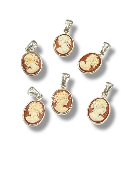 Ciondolo,in argento Sterling 925, montatura a filo, cammeo di prima scelta su conchiglia corniola con incisione testa di donna interamente fatta a mano, dimensione cammeo 10/12mm. Piccole eventuali imperfezioni dovute alla realizzazione a mano non sono considerate difetto ma una peculiarità dell’hand made.