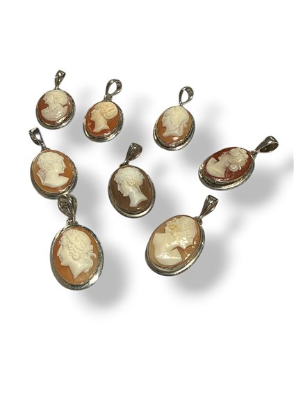 Elegante ciondolo con cammeo di prima scelta inciso su conchiglia naturale raffigurante un classico profilo femminile inciso a mano. Montatura in argento 925 interamente realizzata a mano è caratterizzata da una solida struttura semplice e sobria che mette in risalto il cammeo senza appesantirlo, Completa la montatura un robusto gancio passacatena sempre realizzato in argento con la tecnica della fusione a cera persa. Dimensione cammeo mm 18. Piccole eventuali imperfezioni dovute alla realizzazione a mano non sono considerate difetto ma una peculiarità dell’hand made.