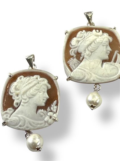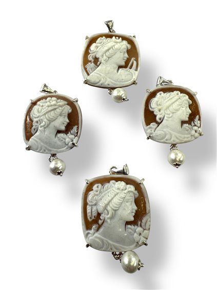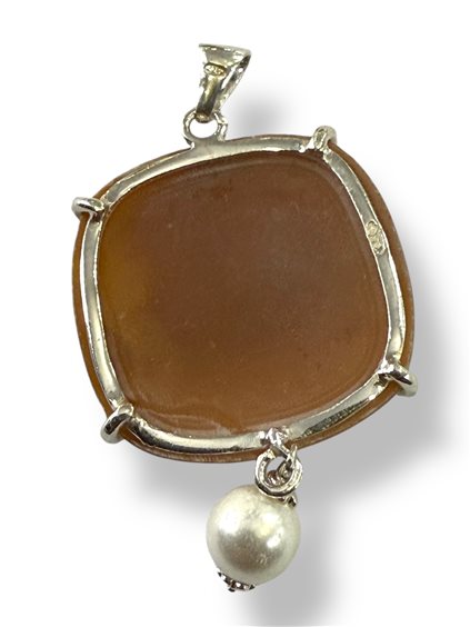 Ciondolo,in argento Sterling 925, montatura a filo con griffe e perla pendente, cammeo di prima scelta su conchiglia sardonica con incisione testa di donna interamente fatta a mano, dimensione cammeo 25 x 25nmm. Piccole eventuali imperfezioni dovute alla realizzazione a mano non sono considerate difetto ma una peculiarità dell’hand made.