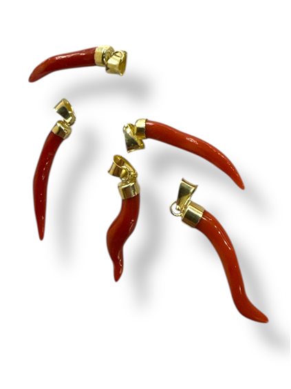 Cornetto portafortuna di corallo rosso naturale con montatura in argento dorato. 4 misura, cm 2,5 ~ 3 Piccole eventuali imperfezioni dovute alla realizzazione a mano non sono considerati difetto ma una peculiarità dell’hand made.