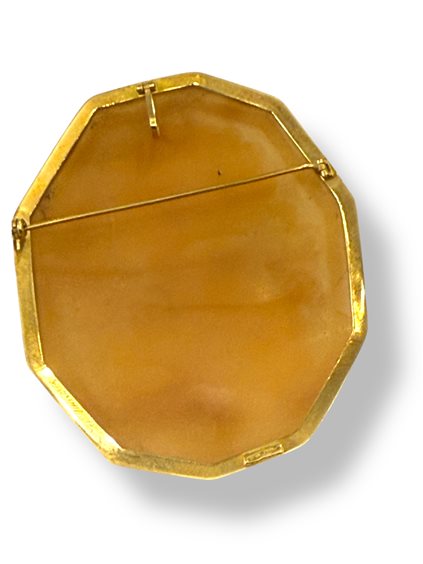 Spilla / Ciondolo in oro 18 Kt 750 /00 montatura classica, battuta, cammeo antico forma decagono su conchiglia sardonica con incisione “Profilo di donna” interamente fatta a mano, dimensione cammeo 60 x 50 mm c.ca Forma esclusivamente unica. Piccole eventuali imperfezioni dovute alla realizzazione a mano non sono considerate difetto ma una peculiarità dell’hand made. Il peso indicato è riferito alla montatura di oro ed è approssimativo.
