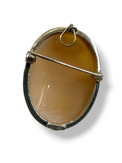 Spilla / Ciondolo in argento sterling 925/00, montatura alla romana interamente fatta a mano, cammeo su conchiglia sardonica inciso a mano raffigurante profilo di dama, dimensione cammeo 30 mm. Piccole eventuali imperfezioni dovute alla realizzazione a mano non sono considerate difetto ma una peculiarità dell’hand made.