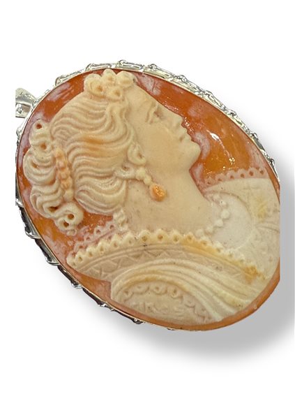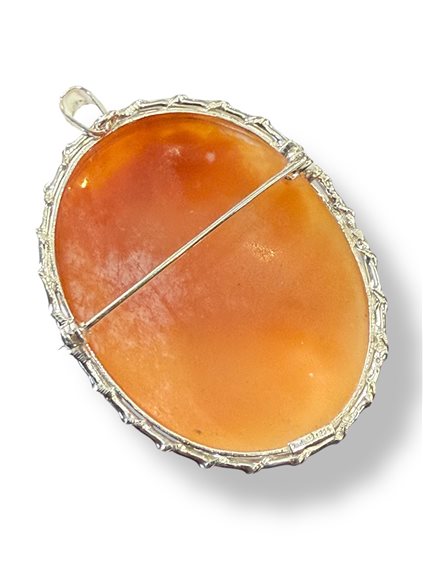 Spilla / Ciondolo in argento sterling 925/00, montatura alla romana con cordellina, interamente fatta a mano, cammeo su conchiglia corniola inciso a mano raffigurante damina del 700, dimensione cammeo 45 mm. Piccole eventuali imperfezioni dovute alla realizzazione a mano non sono considerate difetto ma una peculiarità dell’hand made.