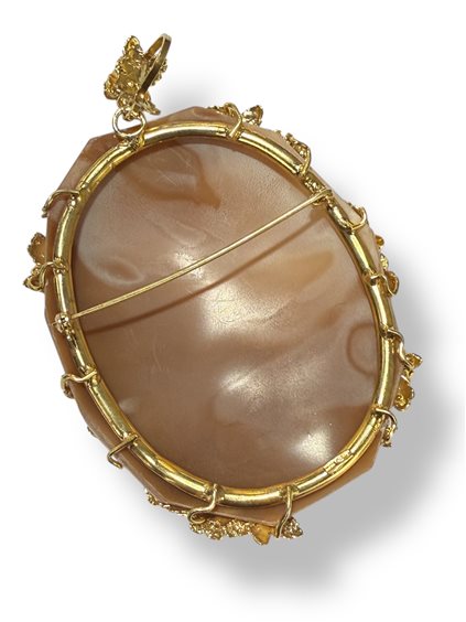 Spilla / Ciondolo in argento sterling 925/00. Colore oro, montatura stile Liberty con elementi floreali in argento dorato; cammeo di grandi dimensioni su conchiglia sardonica, inciso a mano raffigurante Demetra e Persefone, dimensione cammeo 80 x 60 mm c.ca. Piccole eventuali imperfezioni dovute alla realizzazione a mano non sono considerate difetto ma una peculiarità dell’hand made.