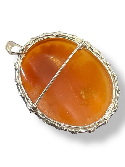 Spilla / Ciondolo in argento sterling 925/00, montatura alla romana con cordellina, interamente fatta a mano, cammeo su conchiglia corniola inciso a mano raffigurante profilo di Saffo, dimensione cammeo 35 mm. Piccole eventuali imperfezioni dovute alla realizzazione a mano non sono considerate difetto ma una peculiarità dell’hand made.