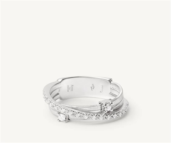 Un elegante anello in oro bianco 18kt: un intreccio di spirale piatta, realizzata grazie all’esclusiva lavorazione artigianale del coil, impreziosito da due diamanti incastonati e da una sofisticata barretta di diamanti taglio brillante.