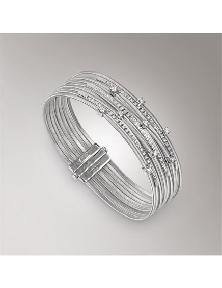 Bracciale in oro bianco a 9 fili con diamanti. Il bracciale Pavè Goa Marco Bicego è realizzato a mano con la tecnica della corda di chitarra firmata Marco.
