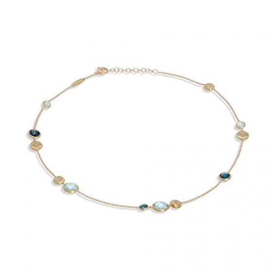 Questo girocollo è caratterizzato da una selezione di Topazi Sky e Topazi London, montati su una finissima catena e alternati a monete d’oro giallo 18kt, incise a mano con l’antica tecnica del Bulino Millerighe.