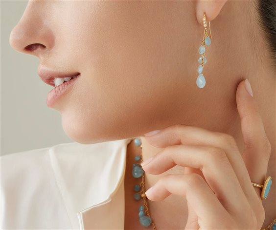 Quest’elegante orecchino pendente in oro giallo 18 carati è impreziosito da un amo in diamanti taglio brillante e da una cascata di acquemarine milky dal caratteristico taglio a cuore, che arricchiscono il gioiello con sfumature delicate.