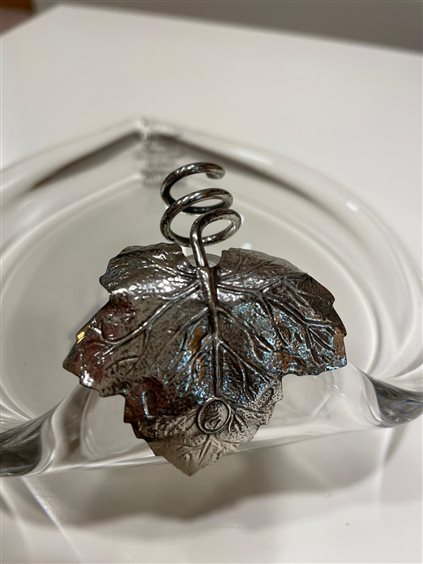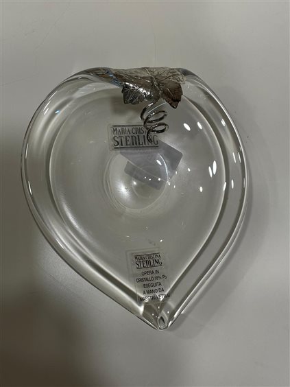 CENTRO TAVOLA FIRMATO MARIACRISTINA STERLING IN CRISTALLO TRASPARENTE A FORMA DI FOGLIA CON FOGLIA DI VITE IN ARGENTO. OPERE ESEGUITE A MANO DA MAESTRI VETRAI