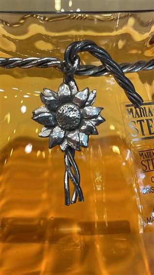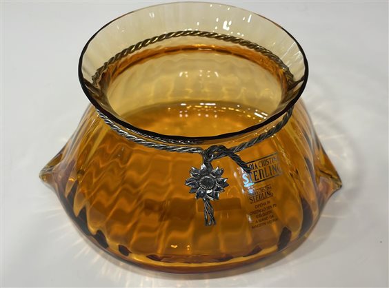 CENTROTAVOLA FIRMATO MARIACRISTINA STERLING A FORMA DI SACCOTTINO IN CRISTALLO CON DECORI IN ARGENTO, GIRASOLE. OPERE ESEGUITE A MANO DA MAESTRI VETRAI