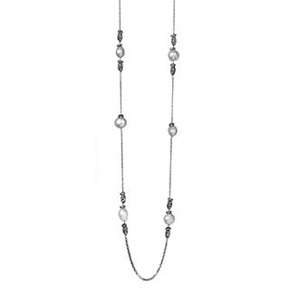 Collana argento intarsiata con perle barocche, in argento 925°% galvanica brunita, questa collana con shivalingam e anellini con perle barocche bianche, con chiusura a T-bar