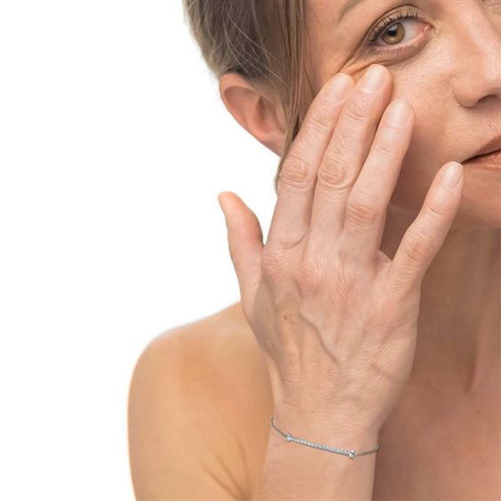 Bracciale in acciaio con catena cutting cross con centrale con cubic zirconia bianchi tondi e sui lati cubic zirconia bianchi a taglio baguette. Vicino al moschettone si trova una tag ovale con inciso sul fronte la scritta "SPARKLE FOREVER", sul retro il logo Marlù. Lunghezza totale 19 cm regolabile tramite cursore. Cubic zirconia bianco presente all' estremità. Materiali: acciaio, cubic zirconia