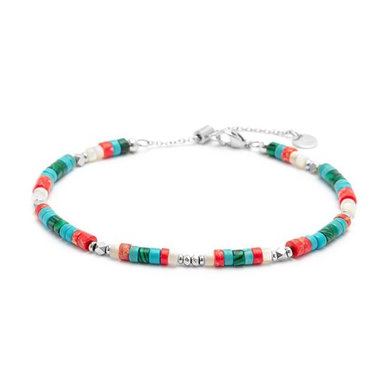 Cavigliera in acciaio con rondelle multicolore alternate. Lunghezza totale 26 cm, regolabile da 26 a 21,5 cm tramite cursore. Marlù logo tag presente all'estremità.