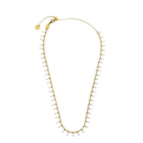 Collana con catena grumetta con pendenti. Su una estremità si trova una tag ovale vicino al moschettone con scritta "make a wish" su entrambi i lati e sull'altra estremità è presente la tag tonda con logo Marlù. Lunghezza totale 44 cm regolabile tramite cursore da 44 cm a 34 cm.